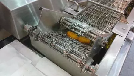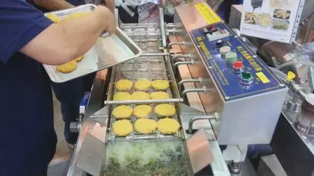 สายการผลิตบนโต๊ะ: การขึ้นรูป→การชุบแป้ง→การเคลือบขนมปัง→การทอด→การลดน้ำมัน